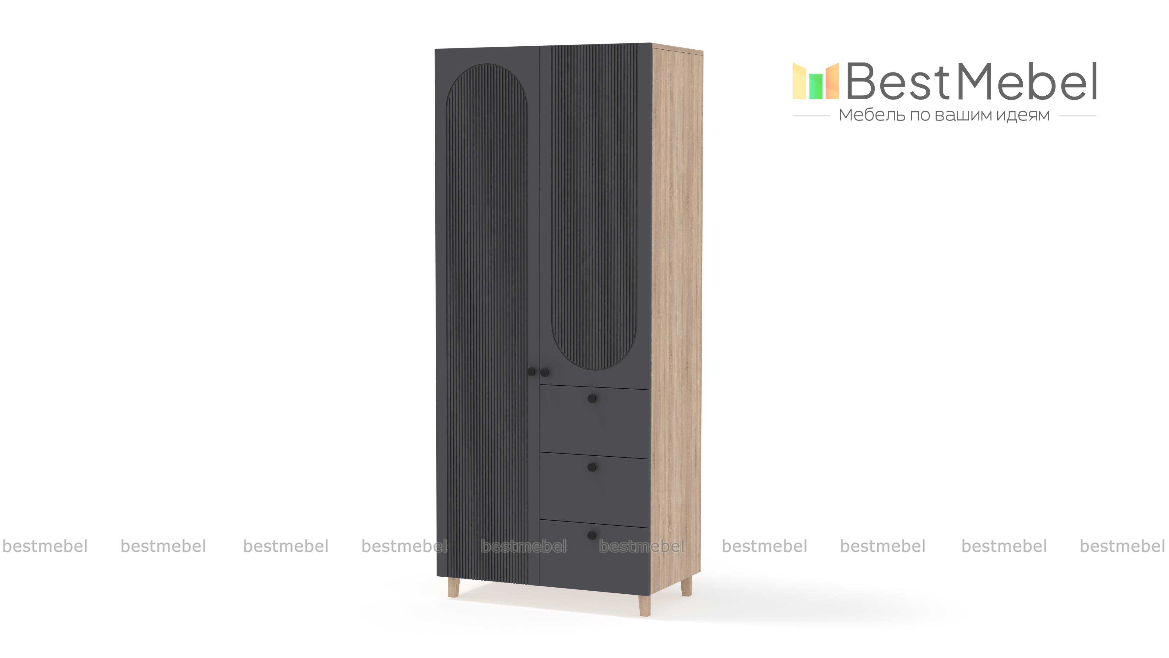 Шкаф распашной Рене 18 BMS — это небольшой гардероб, стильный и функциональный. Для хранения одежды предназначены распашные секции, а дополнение в виде трех выдвижных ящиков позволит разместить в порядке постельное белье и мелкий трикотаж. В отделке фасада шкафа использована оригинальная геометричная фрезеровка, высокие ножки добавят силуэту легкости. Купить шкаф распашной Рене 18 BMS вы всегда сможете в нашем интернет-магазине, самостоятельно подобрав цвета и размеры.