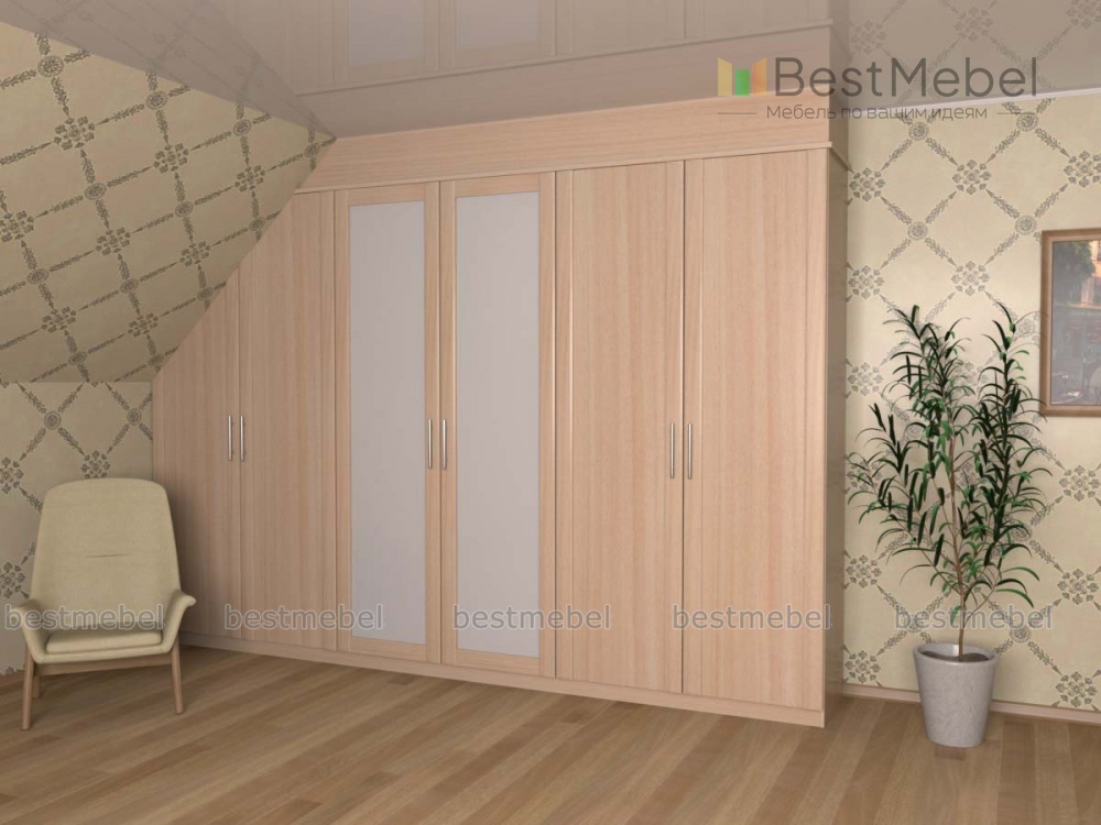 Распашной шкаф 869 BMS дополнит удобной системой хранения помещения нестандартной планировки. Практичная встроенная конструкция со скошенным углом оптимальна для размещения в мансардах и позволяет эффективно использовать доступное пространство. Крупногабаритная композиция включает в себя три распашных двухдверных отделения, в оформлении фасадов сочетаются светлые древесные тона и стекло. Купить Распашной шкаф 869 BMS с учетом необходимых параметров вы сможете в нашем интернет-магазине.