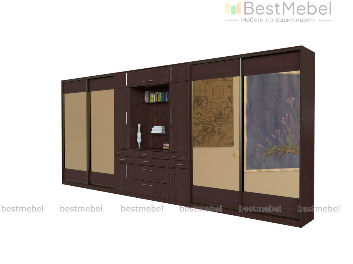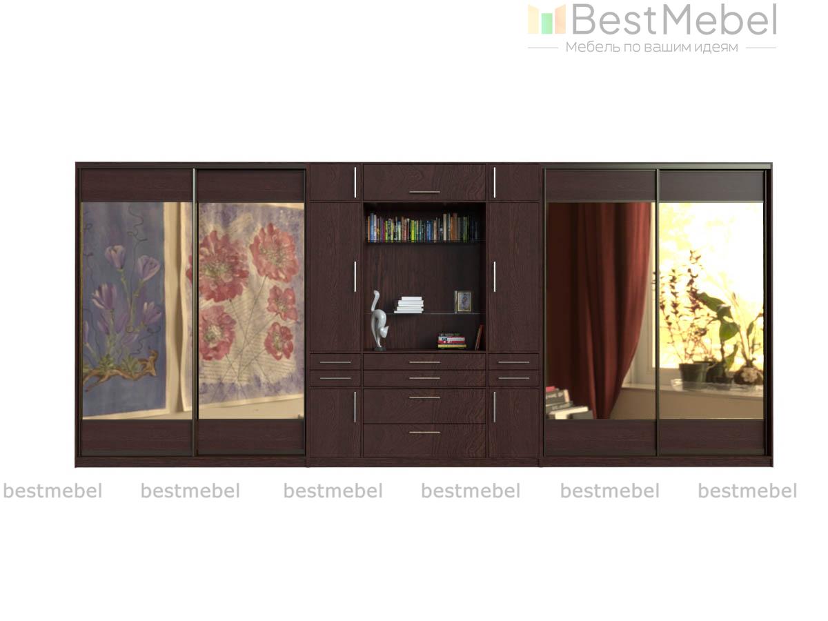 Шкаф-купе 3883 BMS – практичное решение для организации пространства в современной гостиной. Крупногабаритная конструкция, занимающая одну из стен комнаты, выполняет роль стенки и объединяет функции системы хранения и зоны размещения ТВ. Композиция включает в себя два раздвижных шкафа-купе для белья и одежды и центральную секцию с открытыми полками, выдвижными ящиками и распашными отделениями. Фасады в нейтральных древесных тонах дополнены ростовыми зеркалами. Купить Шкаф-купе 3883 BMS приглашаем в наш интернет-магазин по выгодной цене.
