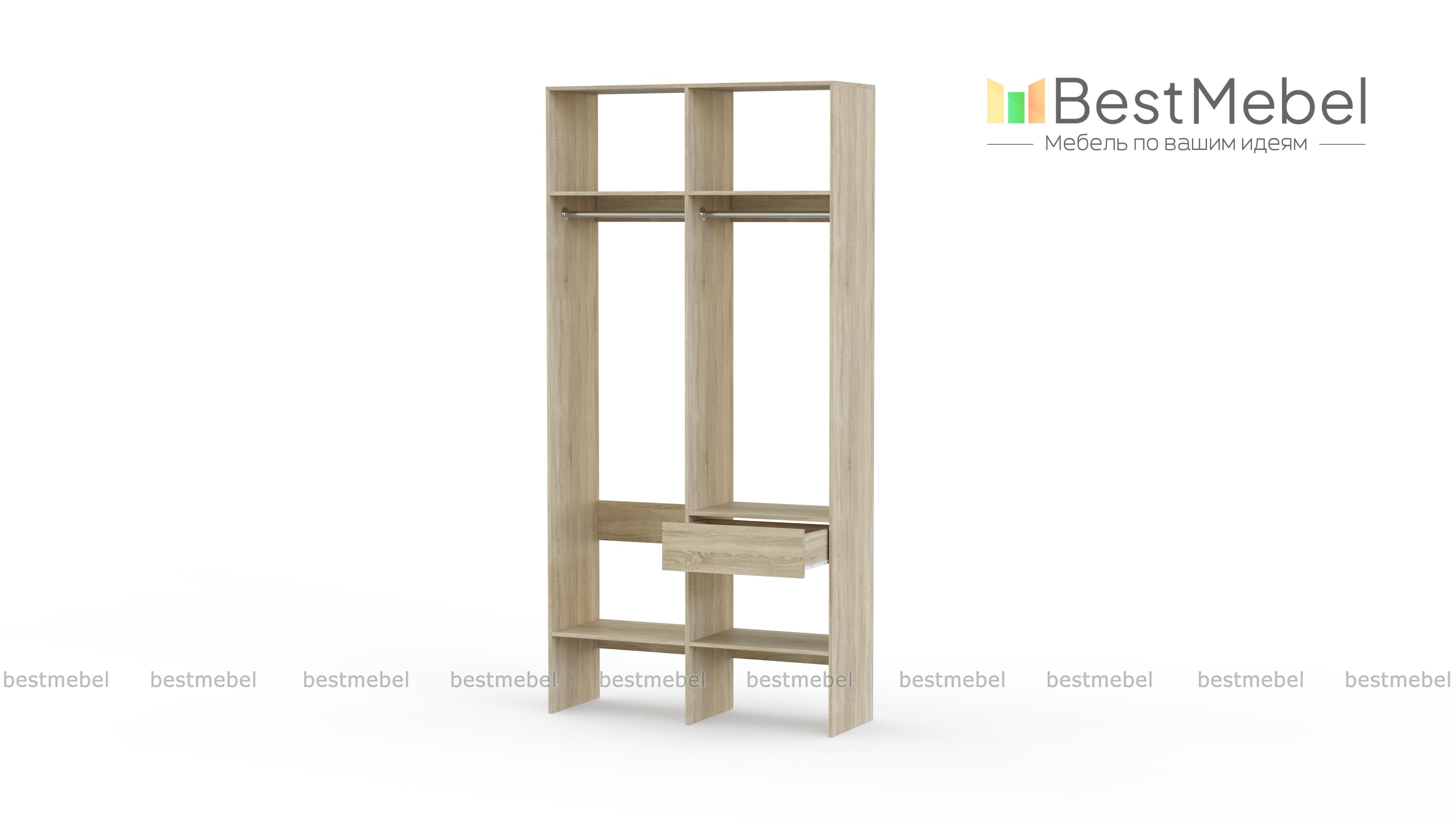 Стеллаж для одежды Мирта 42 BMS для гардеробной или прихожей выполнен в нейтральном светлом оттенке из ламинированной ДСП. Компактная и легкая двухсекционная конструкция объединила два платяных отделения разной высоты, верхние и нижние полки, а также выдвижной ящик, предназначенный для мелочей. В открытом стеллаже будут всегда на виду ваша повседневная одежда и обувь. Купить стеллаж для одежды Мирта 42 BMS вы сможете в нашем интернет-магазине, самостоятельно подобрав размеры и цвет.