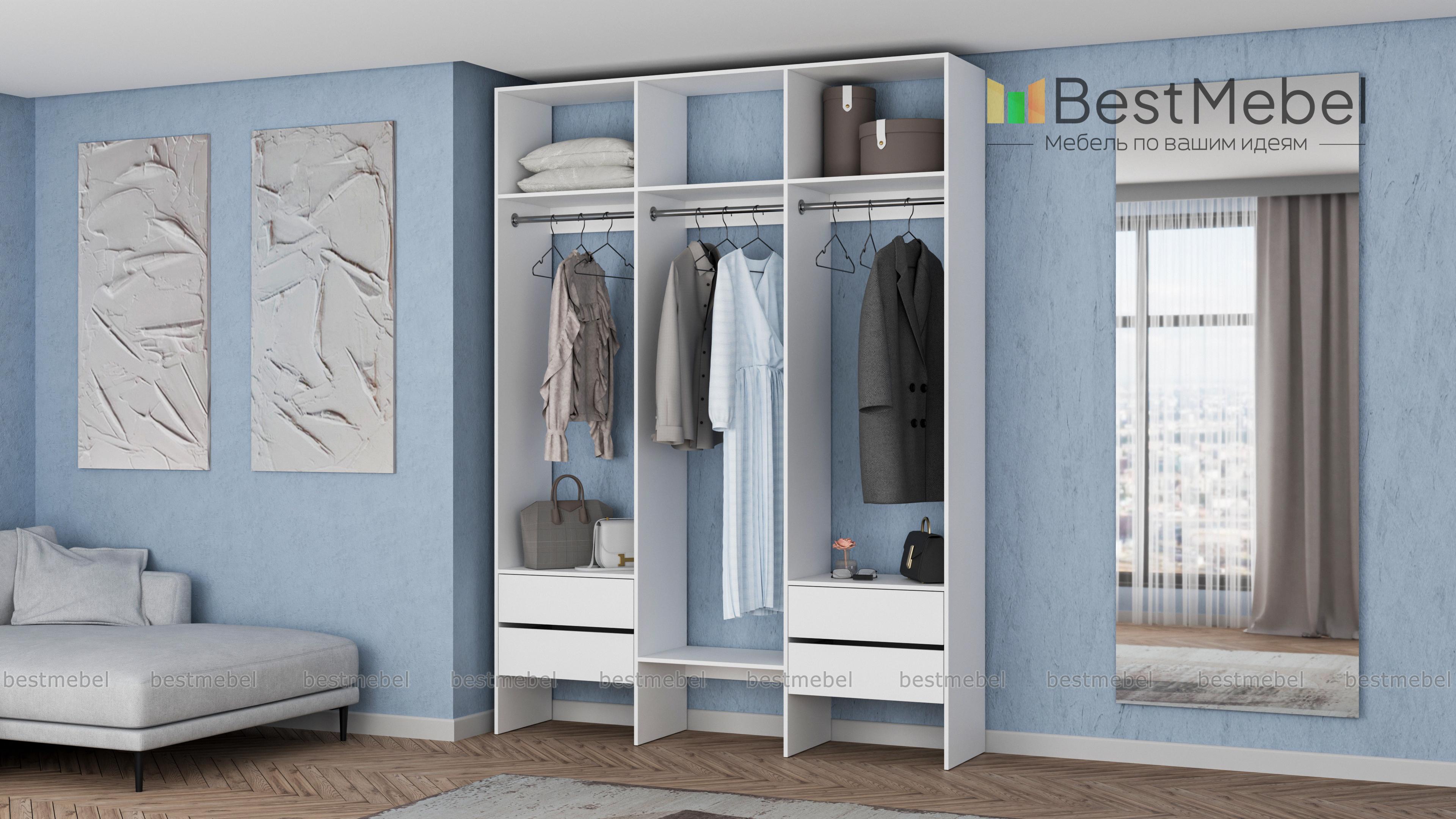 Стеллаж для одежды Мирта 58 BMS — это удобная база для вашей прихожей или гардеробной комнаты. Три перекладины позволяют разместить вешалки с короткой и длинной одеждой, для коробок и сложенных вещей предусмотрены полки, а для мелочей — две пары выдвижных ящиков. Лаконичное оформление и возможность выбора оттенка делают трехсекционный стеллаж практически универсальным. Купить стеллаж для одежды Мирта 58 BMS, изготовленный по вашим размерам, приглашаем в наш интернет-магазин.