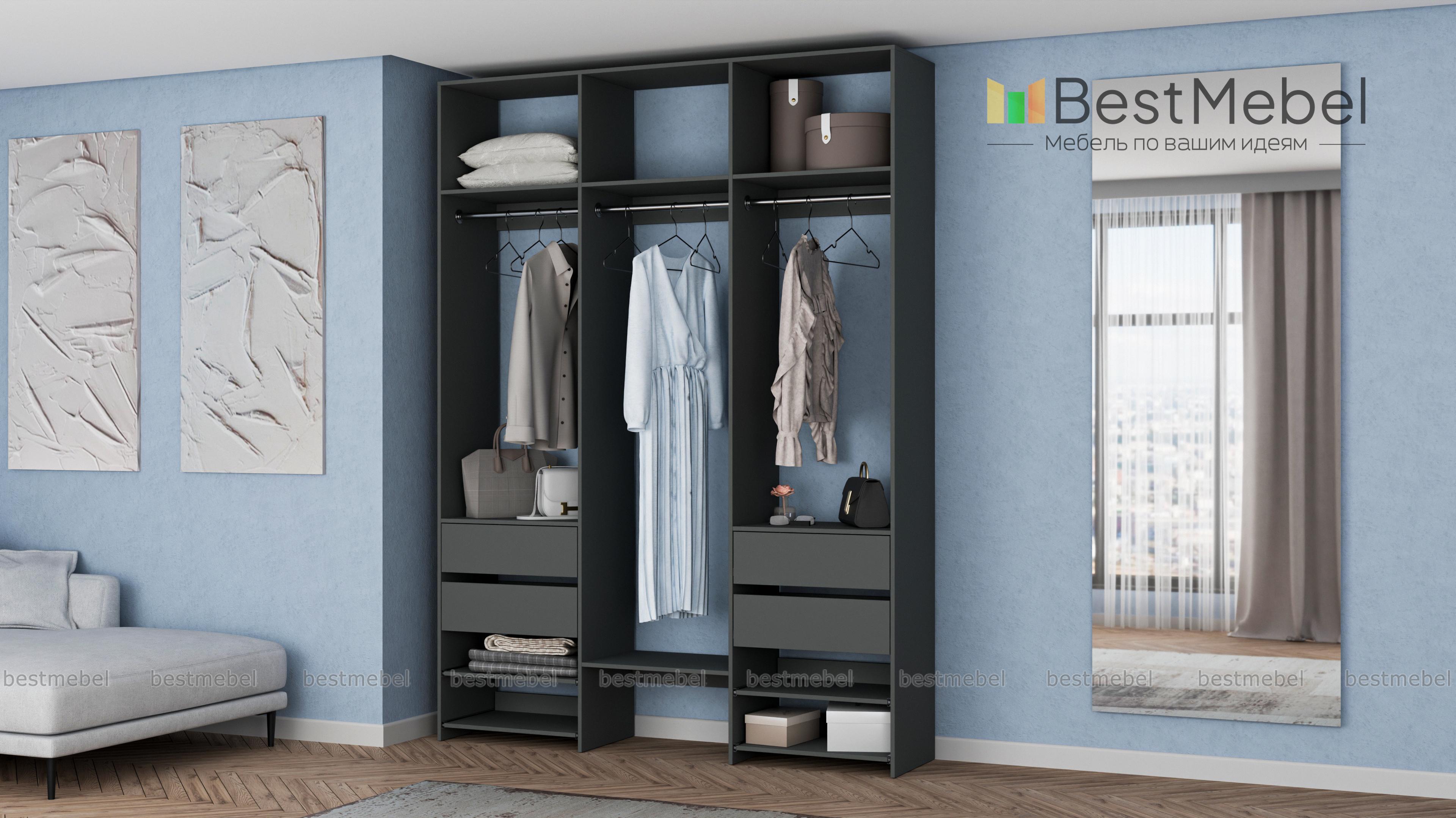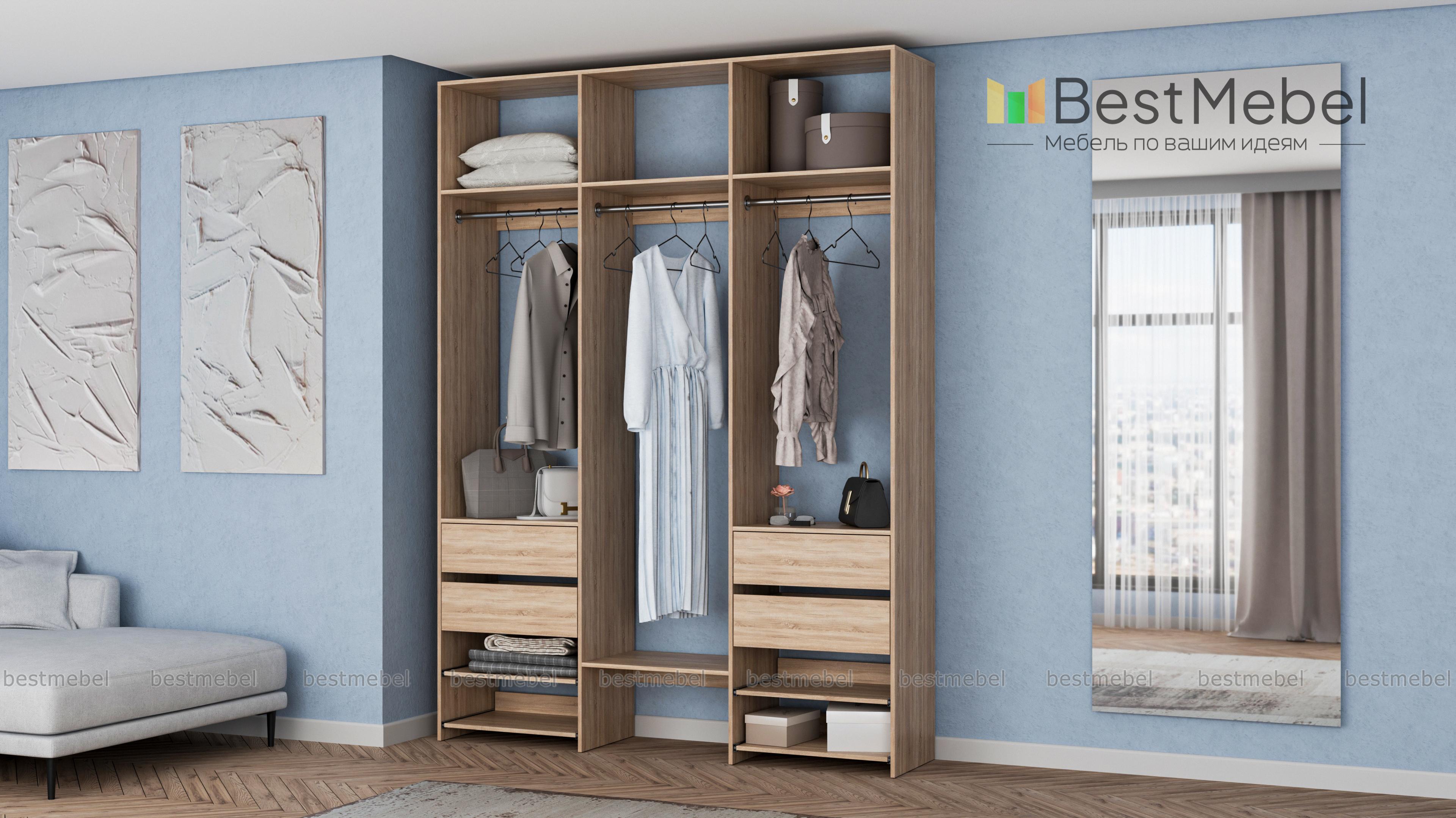 Стеллаж для одежды Мирта 92 BMS обеспечит вашему гардеробу удобное открытое хранение. Три штанги предназначены для короткой и длинной одежды, верхние секции разместят те вещи, что редко используются, а выдвижные ящики и полки — по два справа и слева, облегчат доступ к обуви и мелочам. Ламинированные поверхности стеллажа износостойкие и легко моются. Купить стеллаж для одежды Мирта 92 BMS в необходимом размере и оттенке из каталога вы сможете на сайте нашего интернет-магазина.