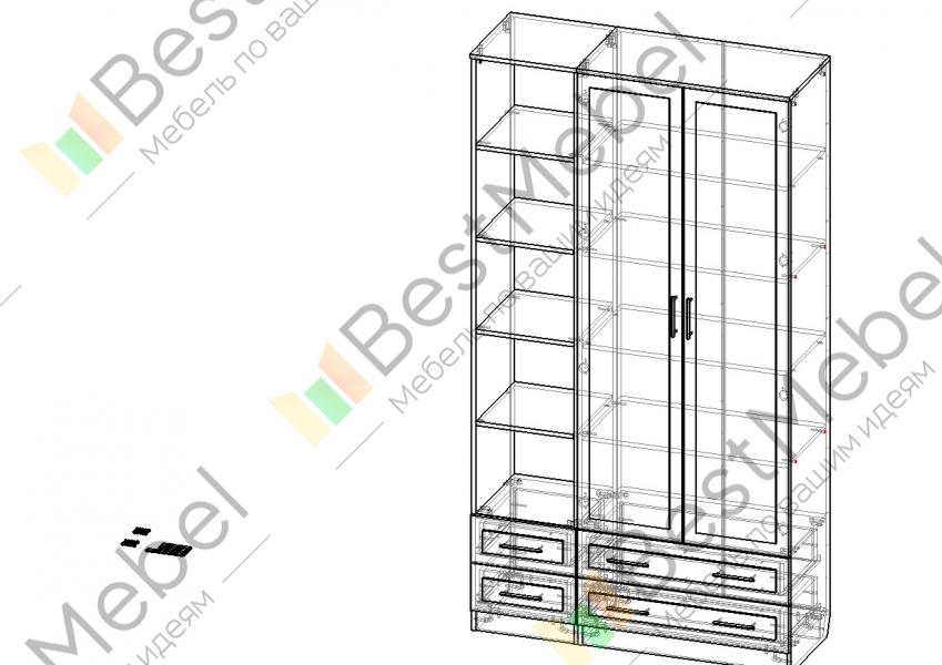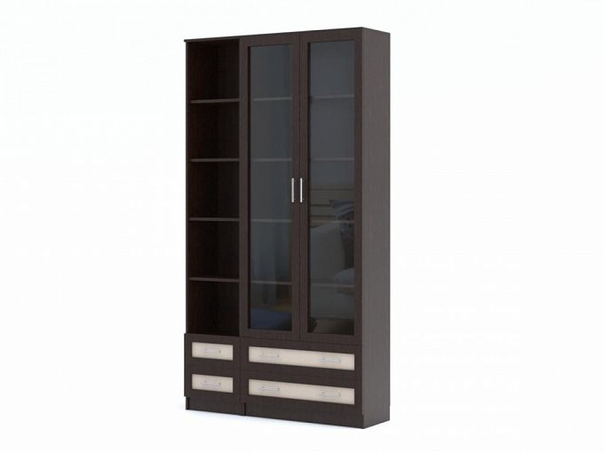 Стеллаж Лина К-13 BMS оборудован двухдверным застекленным отделением и открытыми полками, а в основании располагаются четыре выдвижных ящика – два больших и два малых. Практичная конструкция позволяет компактно разместить книги, рабочие материалы и предметы коллекции, а также разнообразные мелочи. Лаконичный по форме стеллаж с рамочными фасадами выполнен в контрастных древесных тонах. Купить стеллаж Лина К-13 BMS вы сможете в нашем интернет-магазине, подобрав цветовое решение.