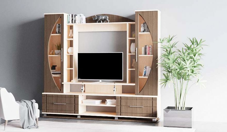 Гостиная Раунд 3 BMS станет центром запоминающегося современного интерьера. Стильная геометричная композиция в контрастных древесных тонах отличается компактными размерами и подходит для меблировки как просторных, так и небольших помещений. Широкая низкая тумба для аппаратуры с подставкой под ТВ дополнена распашными витринами, мини-стеллажами и открытой межсекционной полкой для книг и предметов декора. Стеклянные вставки на фасадах и задняя стенка полки эффектно скруглены. Купить гостиную Раунд 3 BMS вы сможете в нашем интернет-магазине.