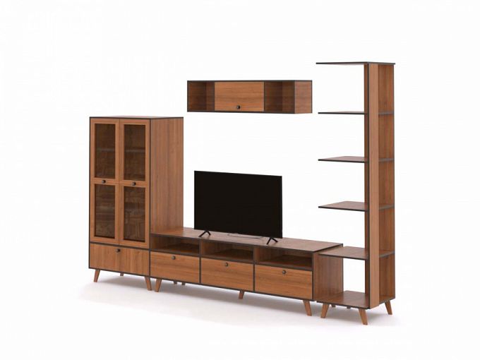 Стенка для гостиной Эсси BMS нарочито проста, функциональна и гармонично смотрится в современных интерьерах стиля лофт или скандинавских. Модульный набор состоит из широкой низкой ТВ-тумбы с ящиками и нишами, шкафа-витрины, высокого книжного стеллажа и навесной полки. Выполненные в теплых древесных тонах, предметы делают гостиную уютной, а легкость и устойчивость им придают высокие скошенные ножки. Купить стенку для гостиной Эсси BMS и разместить аппаратуру, бытовые мелочи, предметы декора и книги вам поможет наш интернет-магазин.