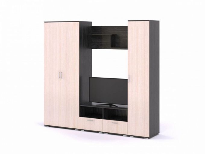 Стенка Оптима BMS подойдет тем, кто ищет недорогой и практичный вариант для обустройства телезоны и хранения вещей. Композиция включает в себя распашной платяной шкаф, пенал, тумбу под аппаратуру и навесную открытую полку для книг и декоративных мелочей. Исполнение в контрастных древесных тонах подчеркивает строгую простоту линий стенки, а гладкие поверхности без декора не требуют сложного ухода. Купить стенку Оптима BMS вы сможете в нашем интернет-магазине с выбором оптимальных размеров и цвета.