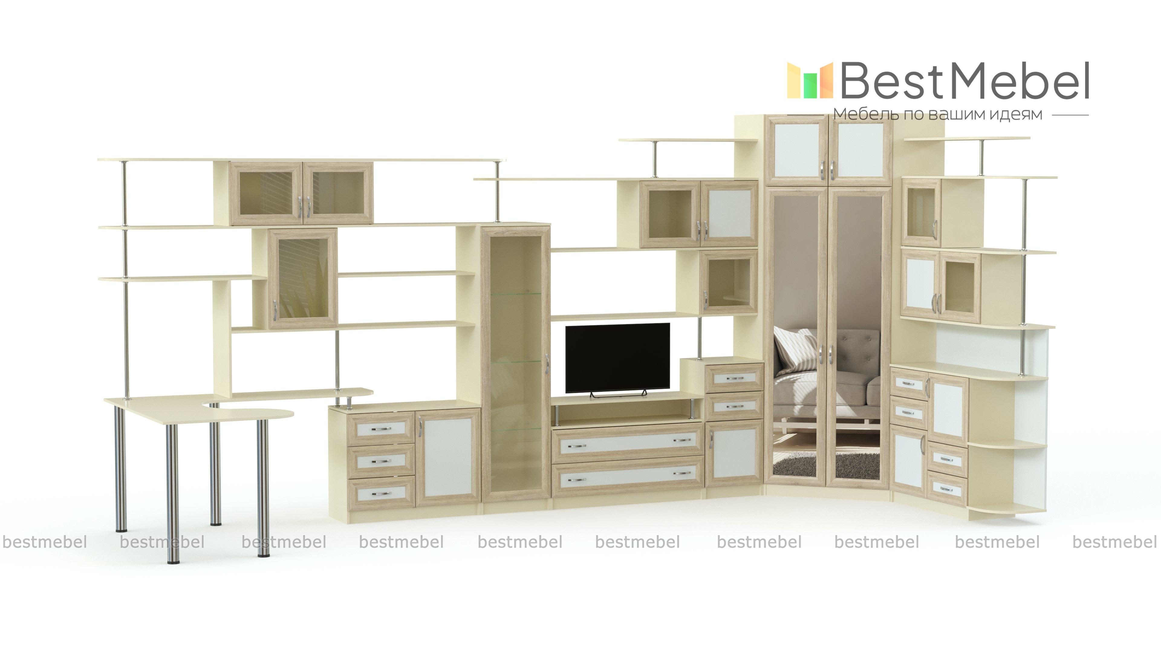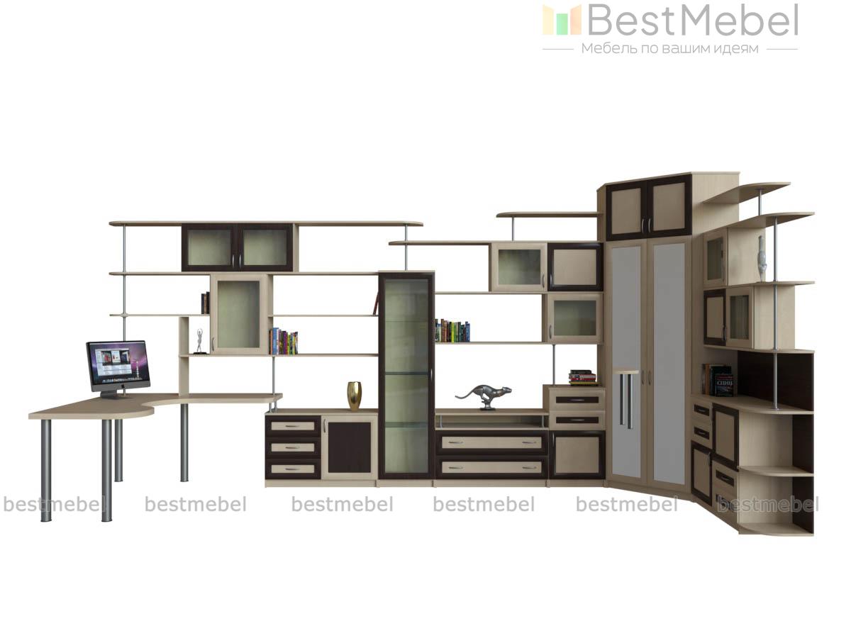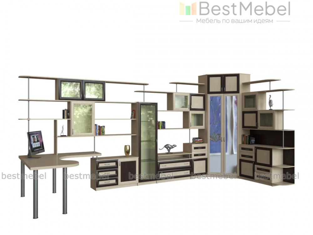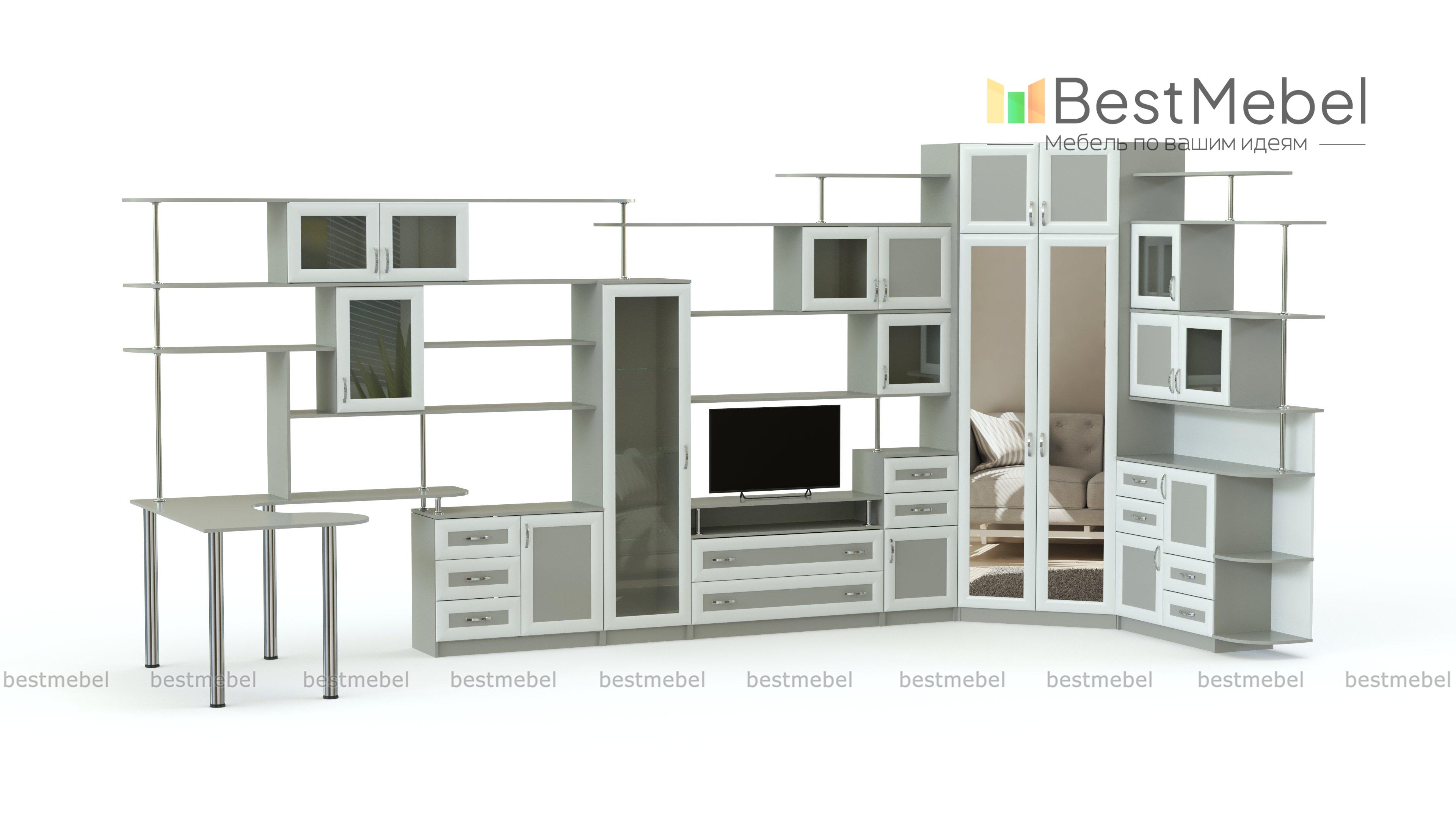 Угловая стенка Евгения 28 BMS поможет организовать комфортное и эргономичное пространство, оборудованное удобной системой хранения, рабочим местом и зоной размещения ТВ. Современная композиция с рамочными фасадами в светлых тонах представляет собой оригинальную вариацию горки и отличается визуальной легкостью, несмотря на габариты. В комплекте компьютерный стол, тумба под ТВ, платяной шкаф, тумбы, открытые навесные полки и шкафчики. Купить угловую стенку Евгения 28 BMS приглашаем в наш интернет-магазин с учетом необходимых параметров.