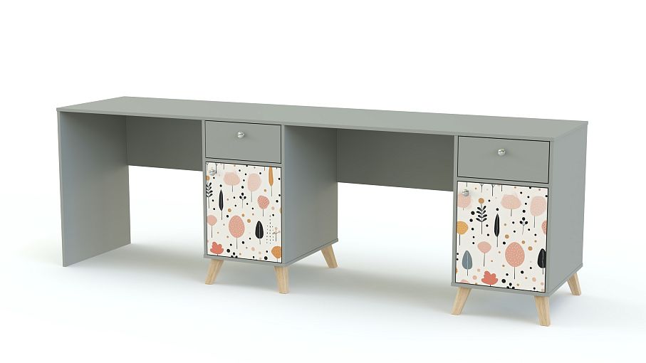 Письменный стол для двоих Эльза 2 BMS поможет обустроить рабочую зону с комфортом для всех. Рабочая столешница широкая, а для хранения канцелярии и тетрадей у каждого ребенка будет своя тумба, оборудованная ящиком и отсеком с распашной дверцей. Конструкция из ЛДСП надежная и долговечная, в спокойную цветовую гамму добавлены древесные акценты и стильная фотопечать. Купить письменный стол для двоих Эльза 3 BMS вы сможете в нашем интернет-магазине с изготовлением по индивидуальным размерам.