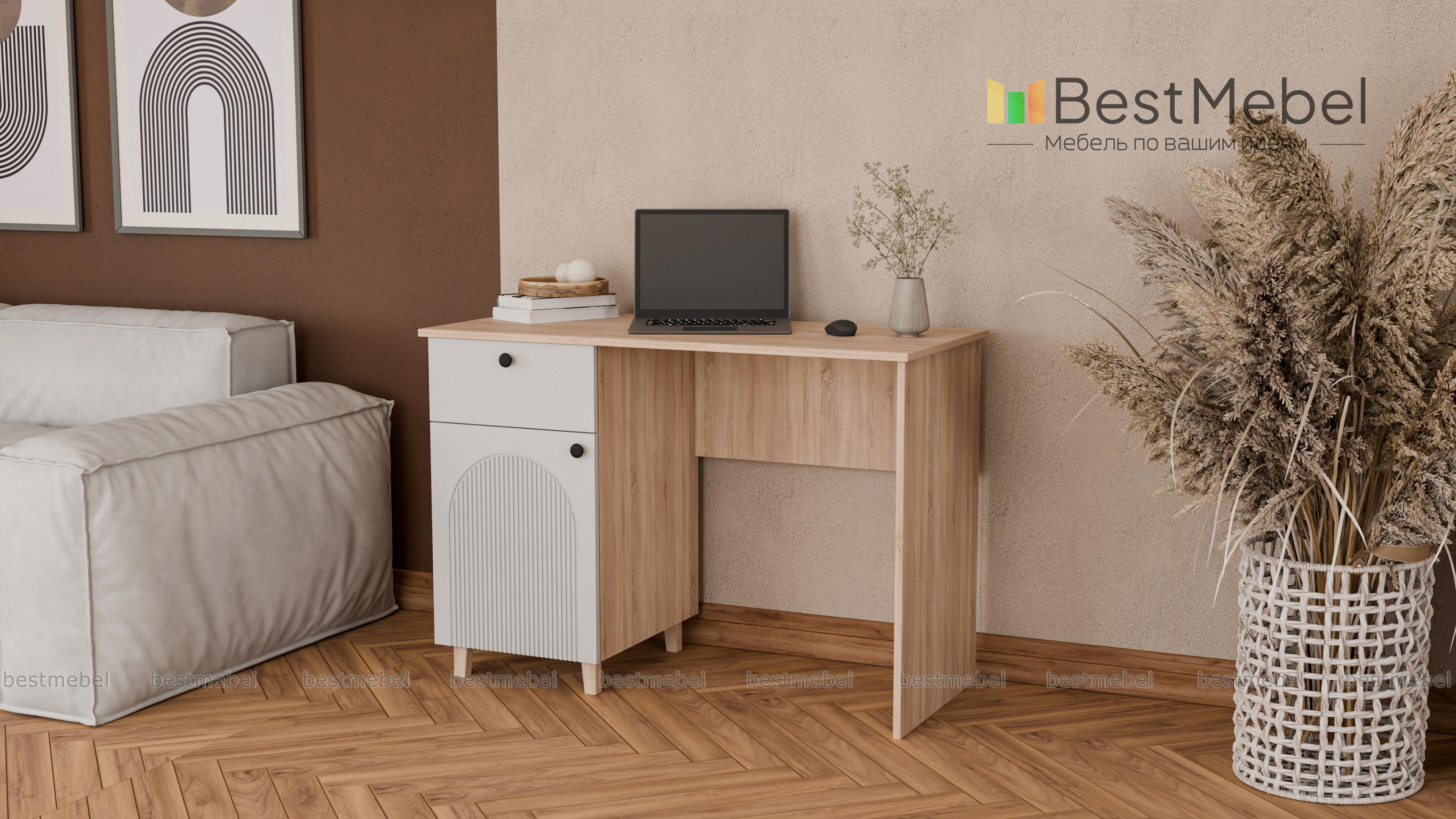 Письменный стол Рене 1 BMS с рифленым фасадом и ножками подходит для меблировки комнаты школьника или кабинета. Выдвижной ящик под столешницей и распашное отделение с полками помогают убрать мелочи, поддерживая порядок на рабочем месте. Благодаря актуальной палитре и стильному рельефу стол гармонично вписывается в современные интерьеры. Купить письменный стол Рене 1 BMS с индивидуальным подбором цвета и размеров вы сможете в нашем интернет-магазине.