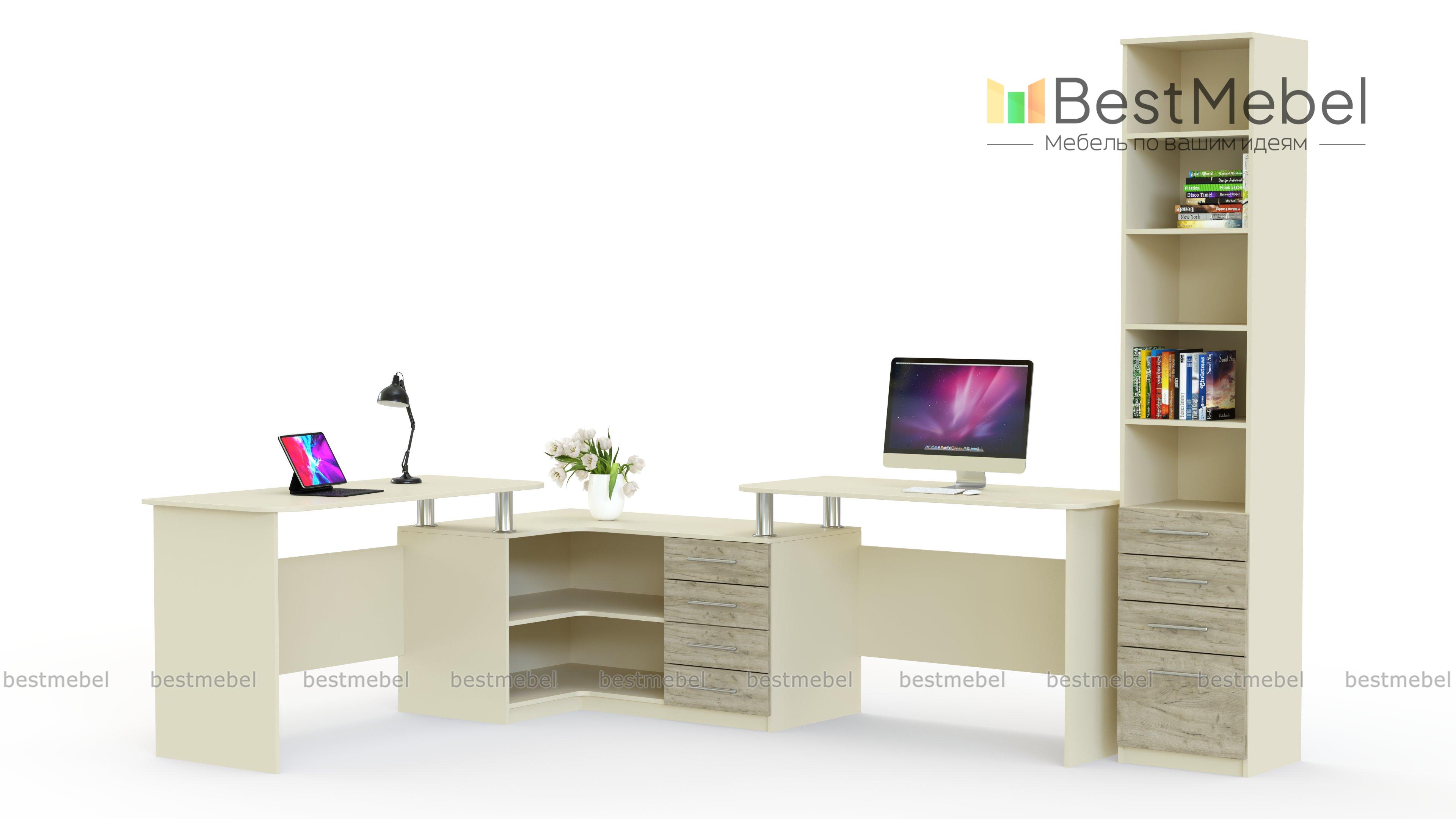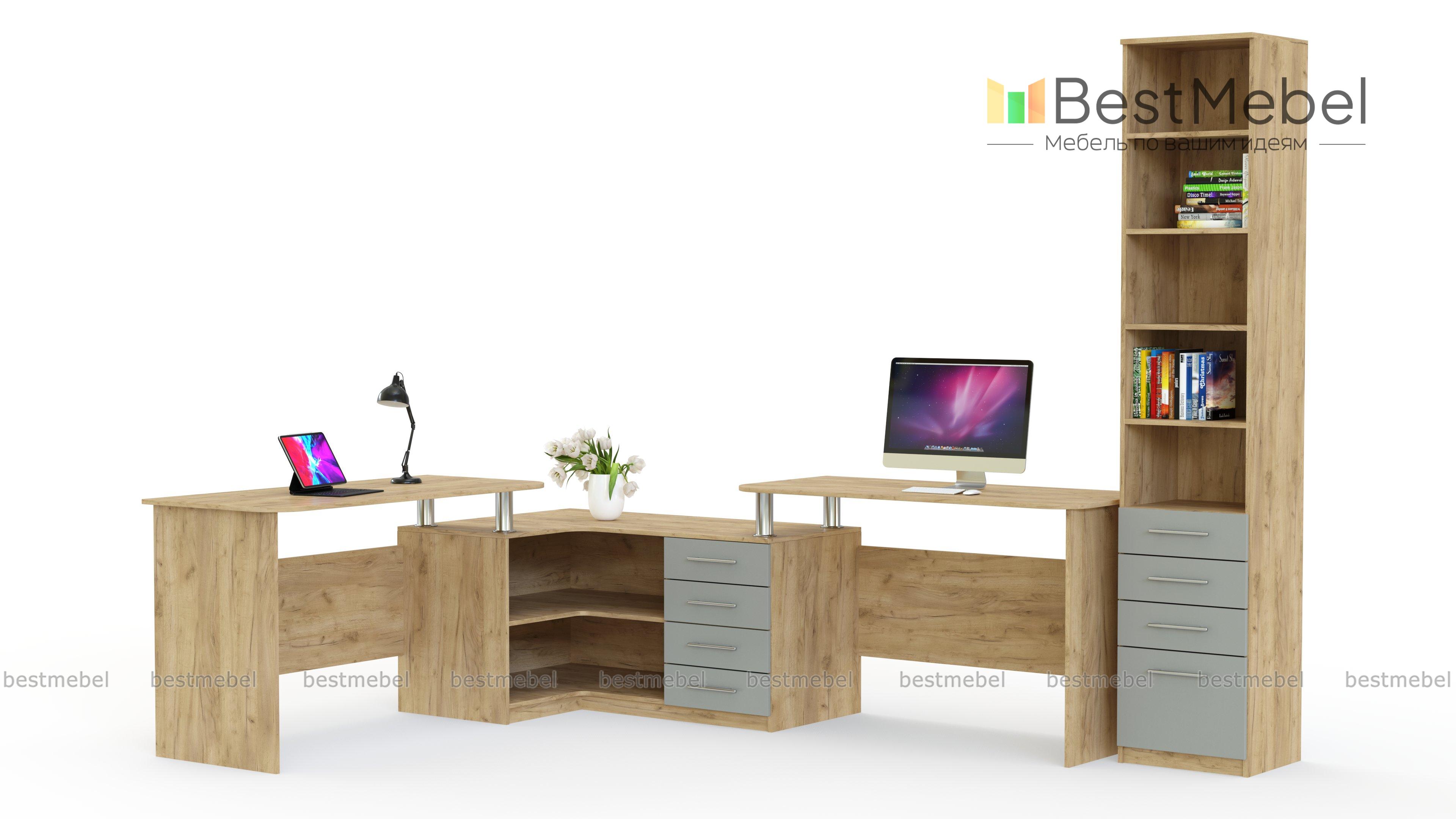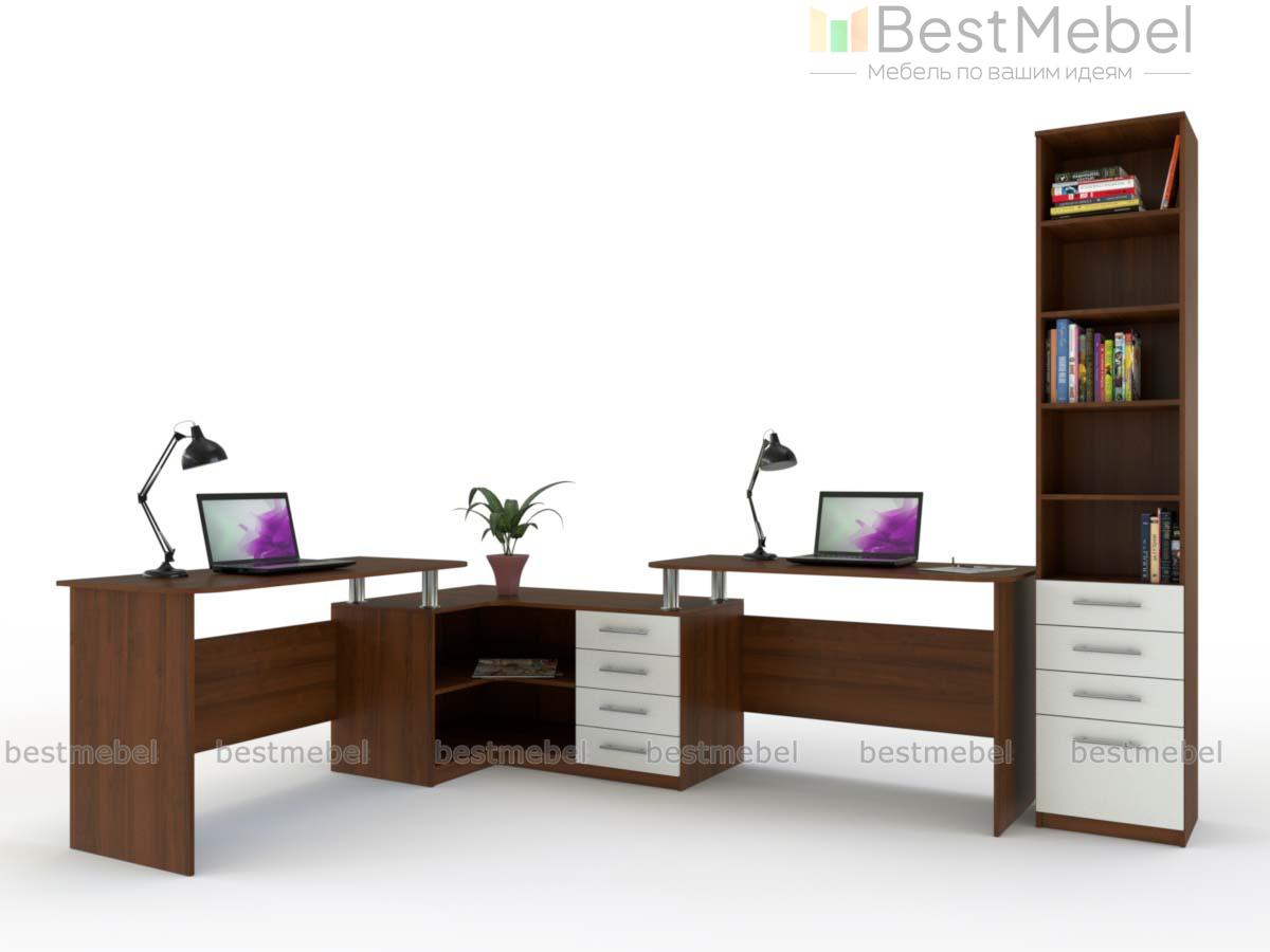 Угловой письменный стол для двоих Канзас 35 BMS станет практичным решением для небольших помещений, помогая по максимуму использовать доступное пространство. Комбинированная модель объединила два прямых письменных стола и угловую тумбу, оборудованную выдвижными ящиками и нишами для хранения необходимых рабочих материалов и канцелярских мелочей. Просторная столешница тумбы позволит разместить под рукой оргтехнику. Купить угловой письменный стол для двоих Канзас 35 BMS приглашаем в наш интернет-магазин по доступной цене.