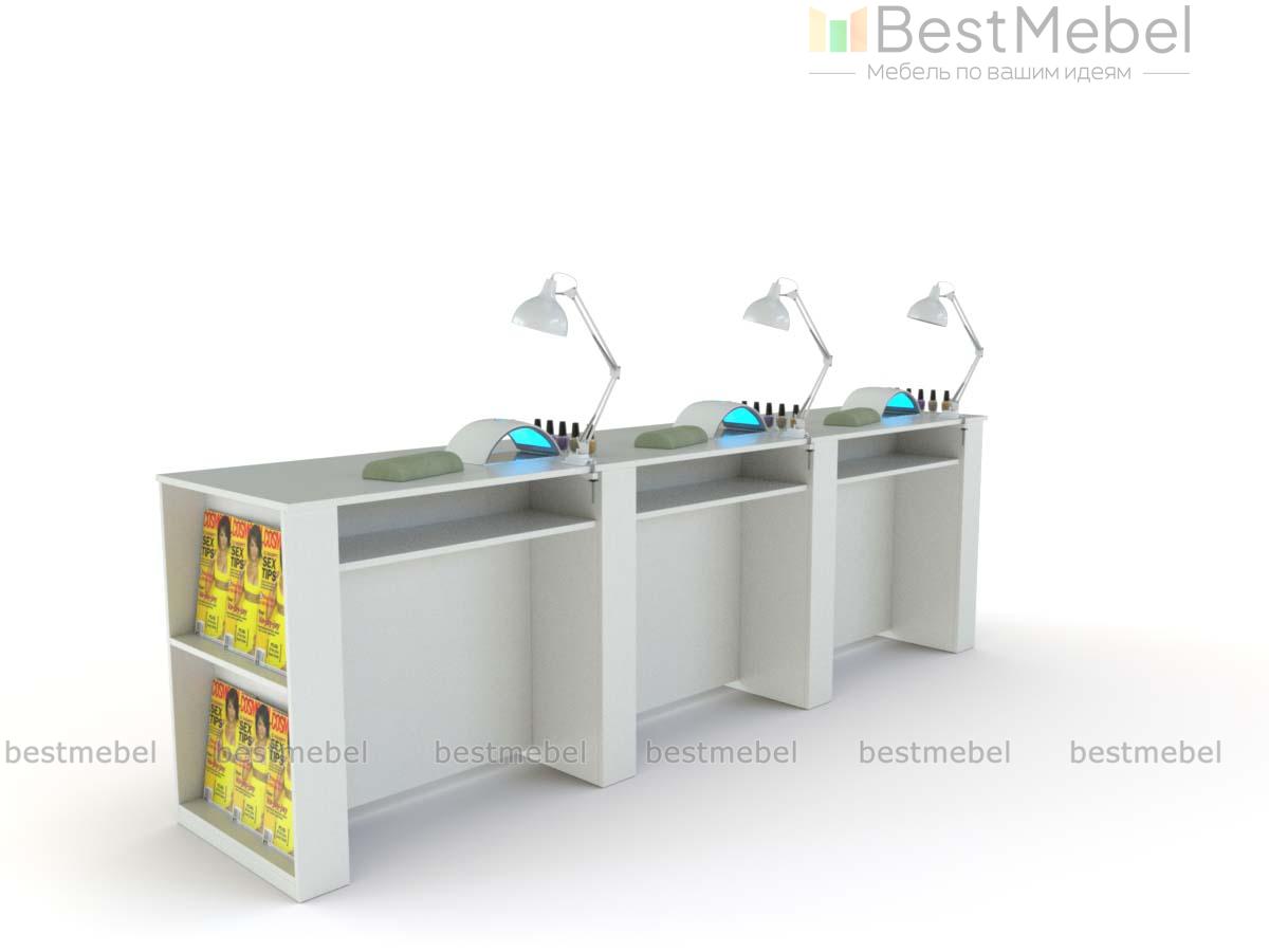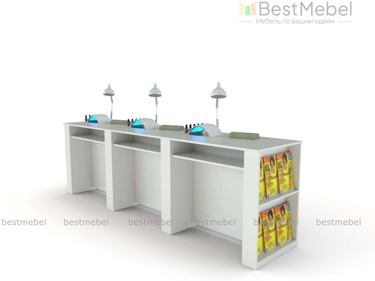 Маникюрный стол Белла BMS предназначен для одновременной работы трех мастеров, позволяя эффективно использовать пространство. Линейная модель оборудована просторной составной столешницей, дополненной индивидуальными открытыми полками, а с торца располагаются стеллажи. Купить маникюрный стол Белла BMS вы сможете в нашем интернет-магазине, подобрав интересное цветовое решение.