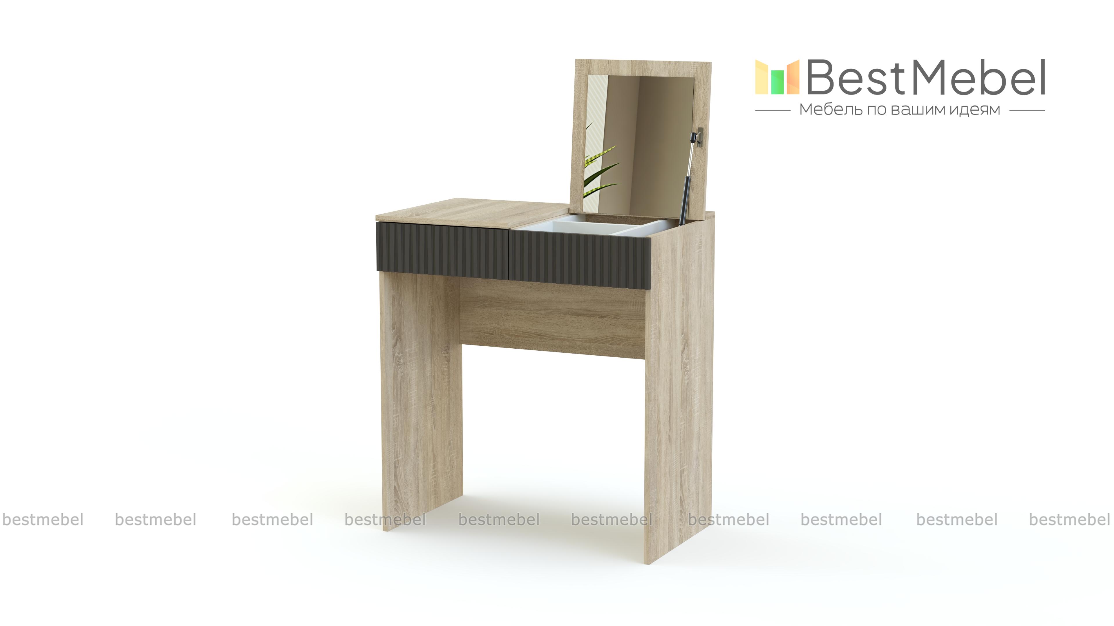 Стол туалетный Осло 12 BMS с фактурным фасадом станет находкой для маленьких спален и студий. Благодаря простой форме и минималистичному дизайну столик легко вписывается в помещения любой планировки и комбинируется с другой современной мебелью. Откидная крышка столешницы, под которой скрыты зеркало и отсек для косметики, позволяет использовать стол как рабочий или макияжный. Купить стол туалетный Осло 12 BMS вы сможете в нашем интернет-магазине с учетом оптимальных размеров.