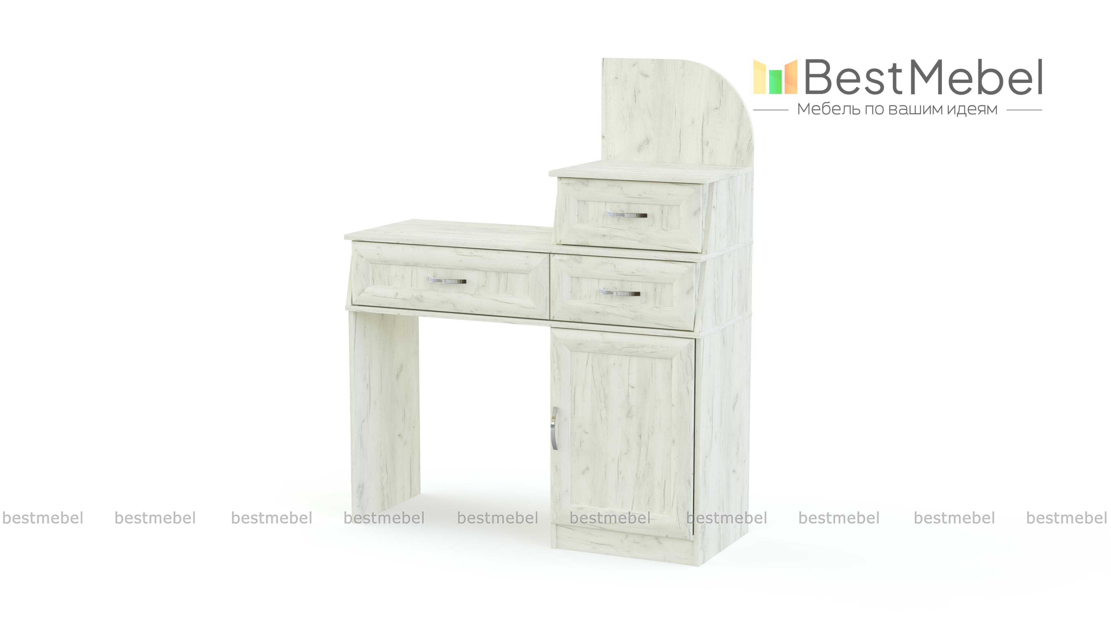 Трюмо без зеркала BMS выполнено в классическом стиле и станет незаменимым элементом меблировки спальни или прихожей. Фасады компактной модели декорированы рамками и изящными ручками-скобами, расцветка – богатая палитра оттенков на выбор. Трюмо представляет собой единую композицию из выдвижных ящиков и распашного отделения. На столешнице располагаются дополнительный выдвижной ящик для украшений и аксессуаров и открытая полочка. Купить Трюмо без зеркала BMS недорого приглашаем к нам в интернет-магазин.