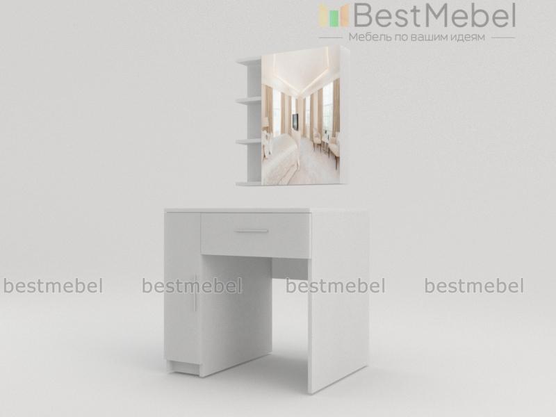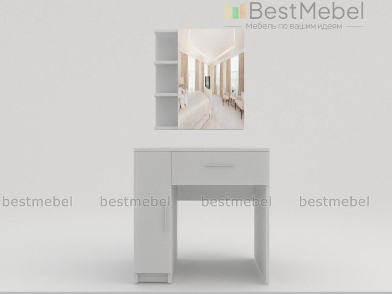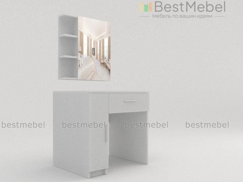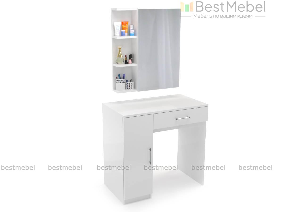 Эта стильная модель в модном белом цвете обладает всеми достоинствами функциональной современной вещи. При компактных размерах столик оборудован не только просторным выдвижным ящиком, но и тумбой. За зеркальной дверцей навесного шкафа, зрительно расширяющей пространство, вы найдете две вместительные полки, а еще несколько – на угловой секции. При этом туалетный столик Хит-1 BMS отличается оригинальным дизайном и гармоничными пропорциями, делающими эту модель неизменно популярной.