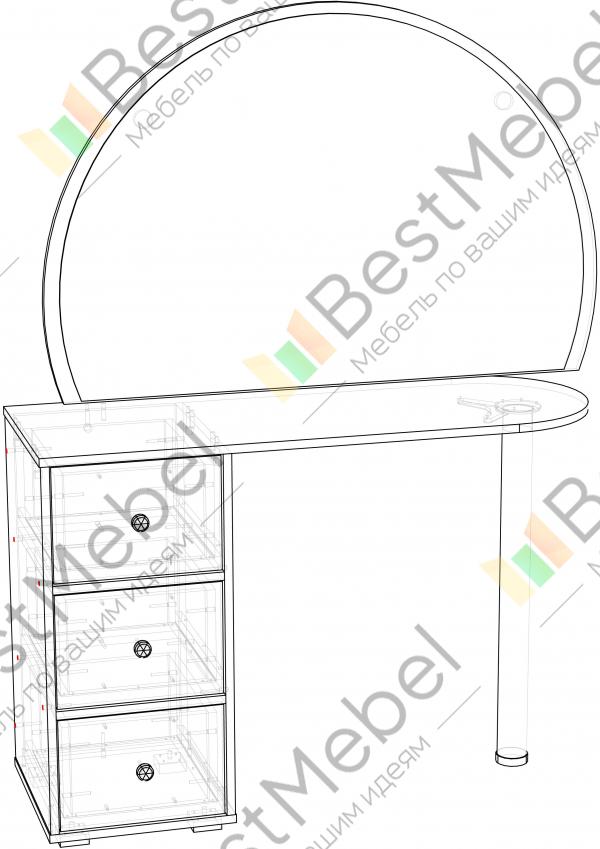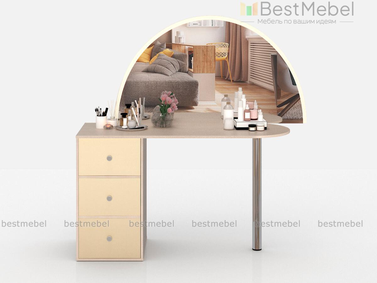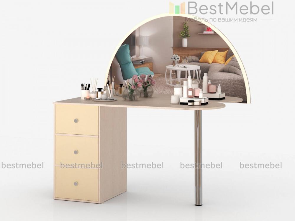 Туалетный столик Хлоя 19 BMS станет частью дизайнерского интерьера в стиле модерн. Эффектная модель, выполненная в древесных тонах, отличается нестандартной геометрией, объединяя большое полукруглое зеркало и тумбу. Широкая столешница и три выдвижных ящика разных размеров помогут разместить под рукой необходимые уходовые средства, а равномерное освещение обеспечит окантовка зеркала светодиодной лентой. Купить туалетный столик Хлоя 19 BMS выгодно приглашаем в наш интернет-магазин.