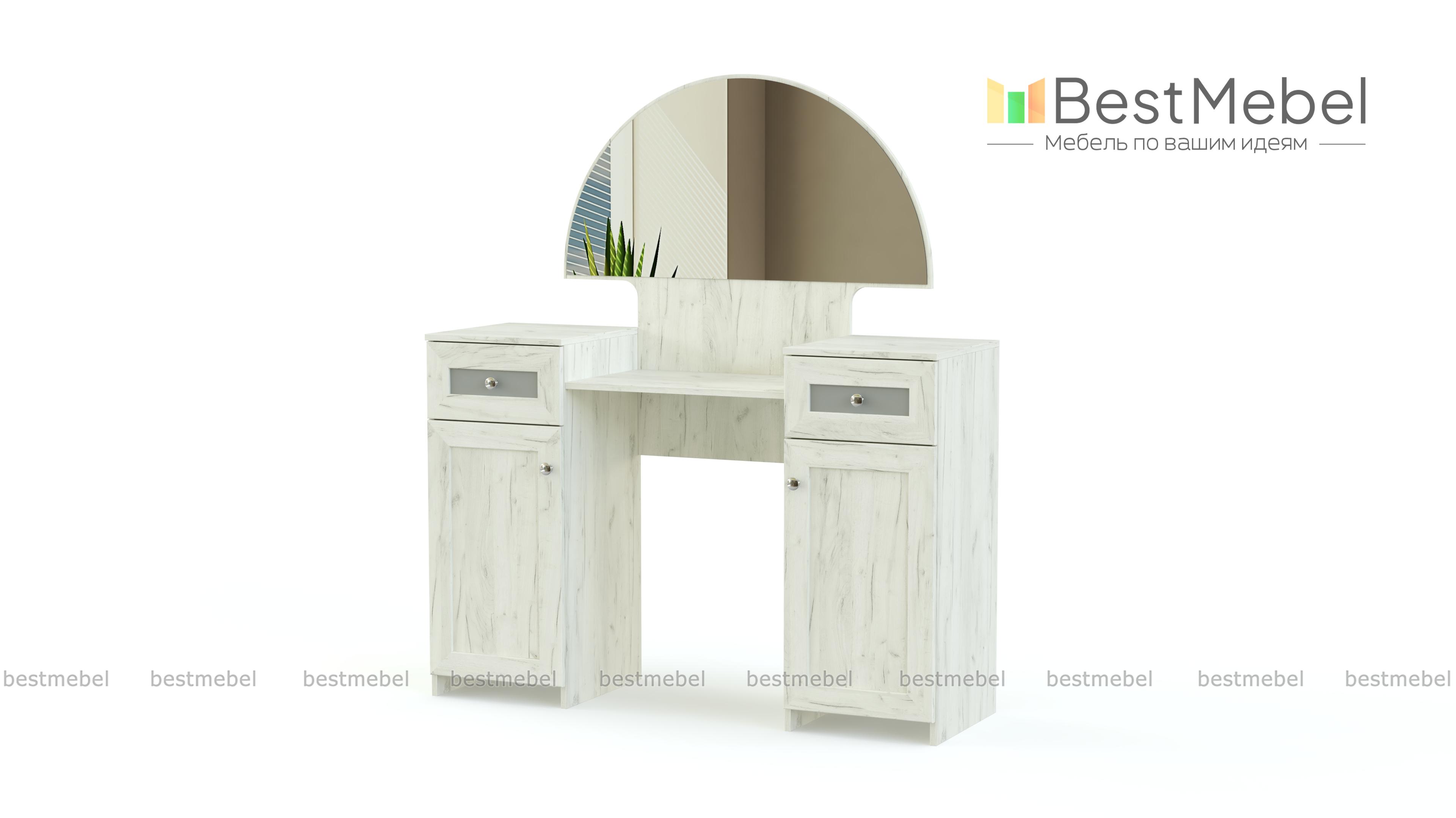 Эта роскошная модель в классическом стиле сделает вашу спальню уютной, а уход за собой – особенно легким и приятным. Красивое полукруглое зеркало для макияжа дополнено полкой под косметику, а также двумя удобными тумбами с выдвижными ящиками и распашными дверцами с декором. Благодаря естественной благородной расцветке, выбрать которую вы сможете на нашем сайте, стильной отделке фасадов и фурнитуре серебристого оттенка туалетный столик Типони 1 BMS выглядит сдержанно и дорого.