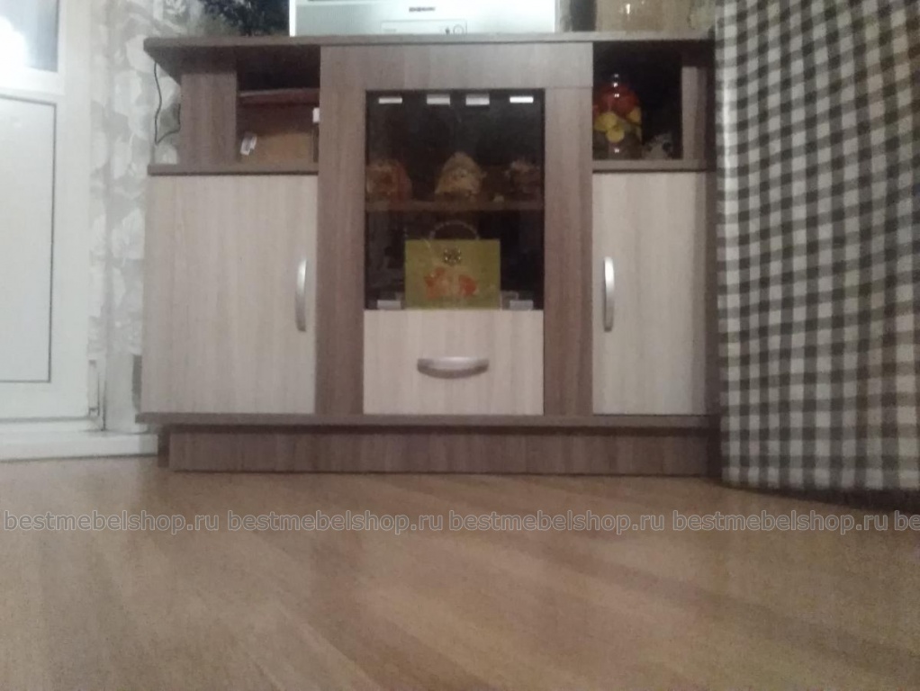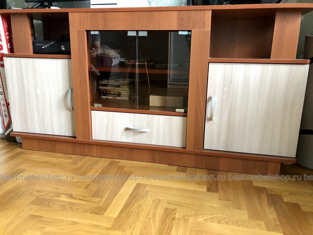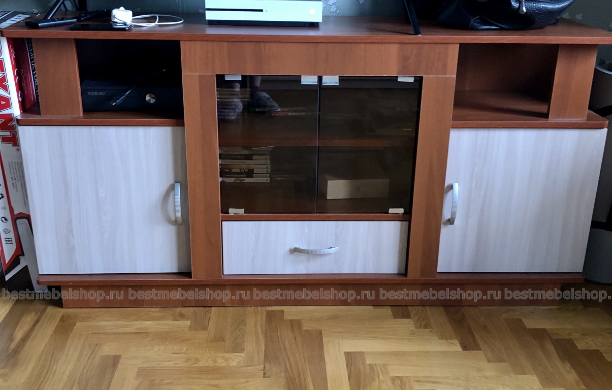 Заказ 00000564751, изделие Тумба под телевизор Виста-11 BMS (1300х750х300)Было необходимо подобрать тумбу под TV по ранее выбранной цветовой гамме мебели и размерам. Оформили заказ в BestMebelShop: тумба под телевизор Виста-11 BMS , габариты 1300х750х300 мм. Это наша вторая покупка в этом интернет-магазине за полгода. Изготовили за 3 дня, доставили в согласованное время — в 23.30. До оплаты курьеру наличными была возможность проверить качество и комплектацию изделия — все ОК. Схема сборки (простенькая) имеется, проблем с самостоятельной сборкой не было. При оформлении заказа выбрали дополнительные опции: ПХВ кромка 2*19 мм, петли с доводчиком, ручки Боярд сатин (металл).Стоимость заказа 9550 руб., с учетом имеющихся у нас бонусов за первую покупку всего к оплате с доставкой вышло 8287 руб. Аналогичные изделия есть в магазинах под заказ, сроки изготовления от 14 до 45 дней, 50% предоплата. Покупкой довольны. На фото две стеклянные дверцы заменены на одно (стекло бронза 360х370 мм) — так удобнее.