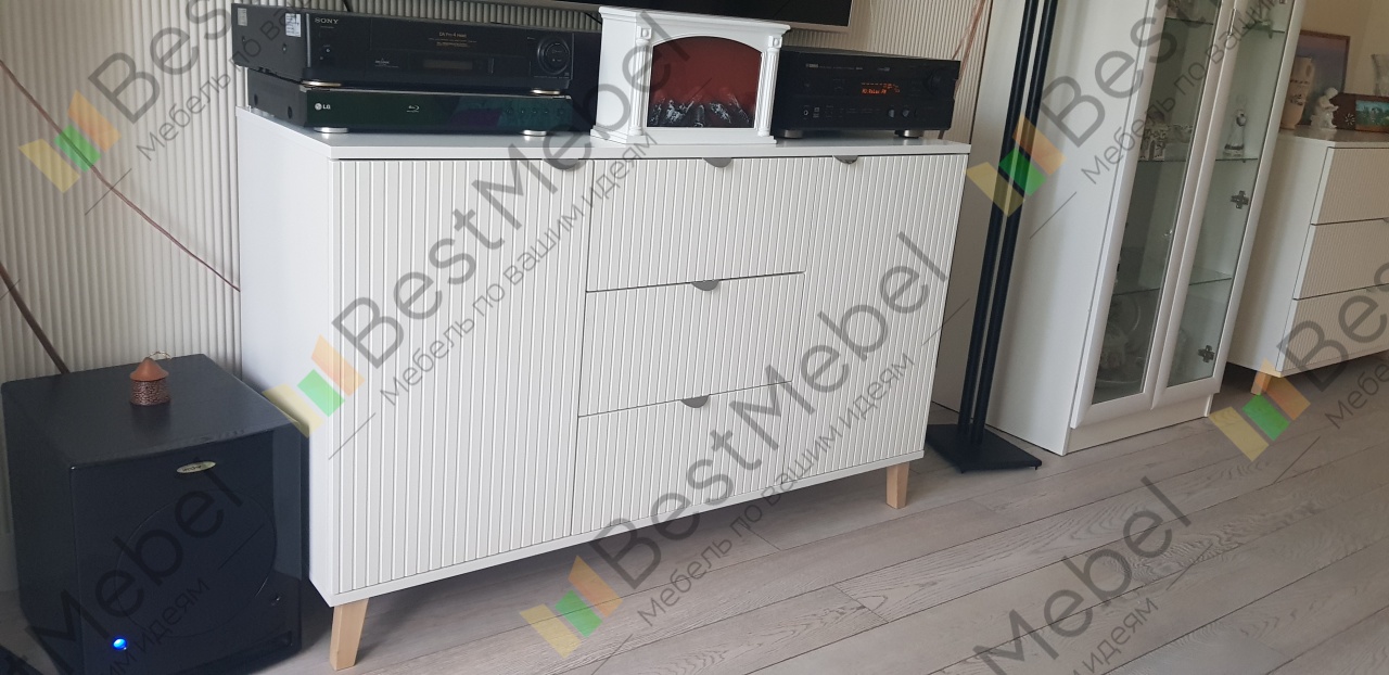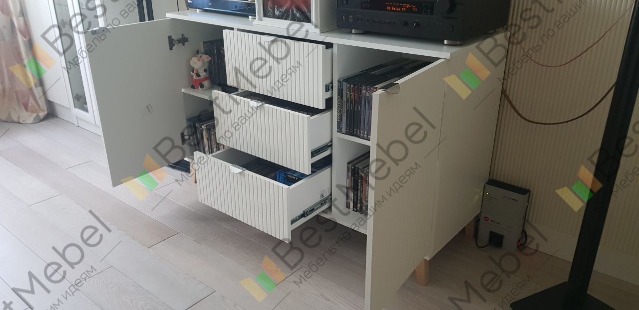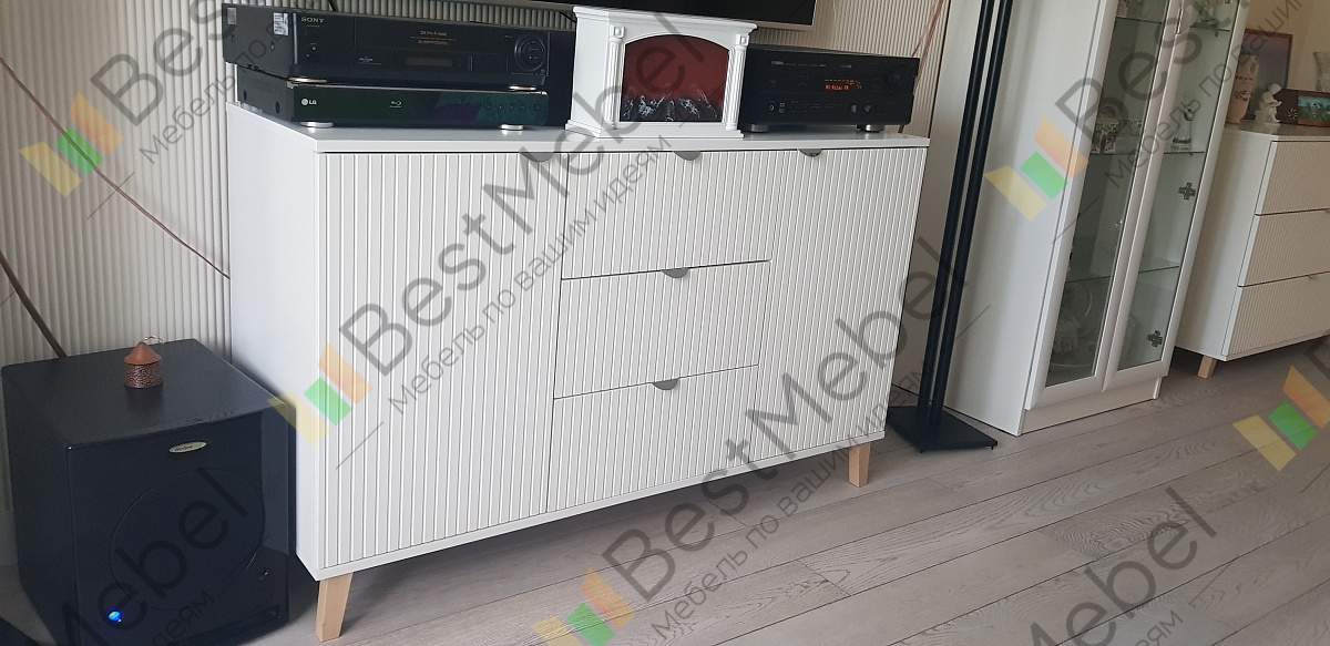 Заказывал тумбу строго под определенный размер и дизайн. К уже имеющимся комоду и витрине. Вышло очень похоже. Удачное сочетание дверей с полками по краям и трёх ящиков в центре.